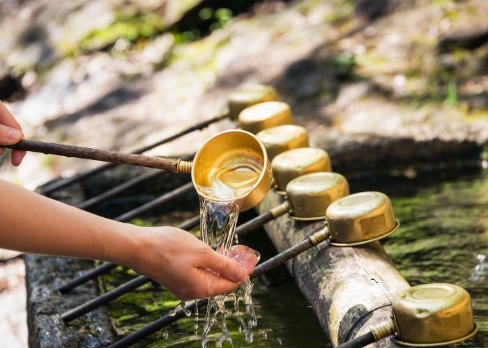 – Purification (Temizu): Before approaching the main shrine, purify yourself at the temizuya (water pavilion). Using a ladle to scoop water, rinse your left hand then your right hand, transfer the ladle to your left hand and pour water over your right hand to rinse it. Then cup water with your left hand to rinse your mouth. Finally, rinse the ladle. Please don’t put your mouth directly to the ladle.